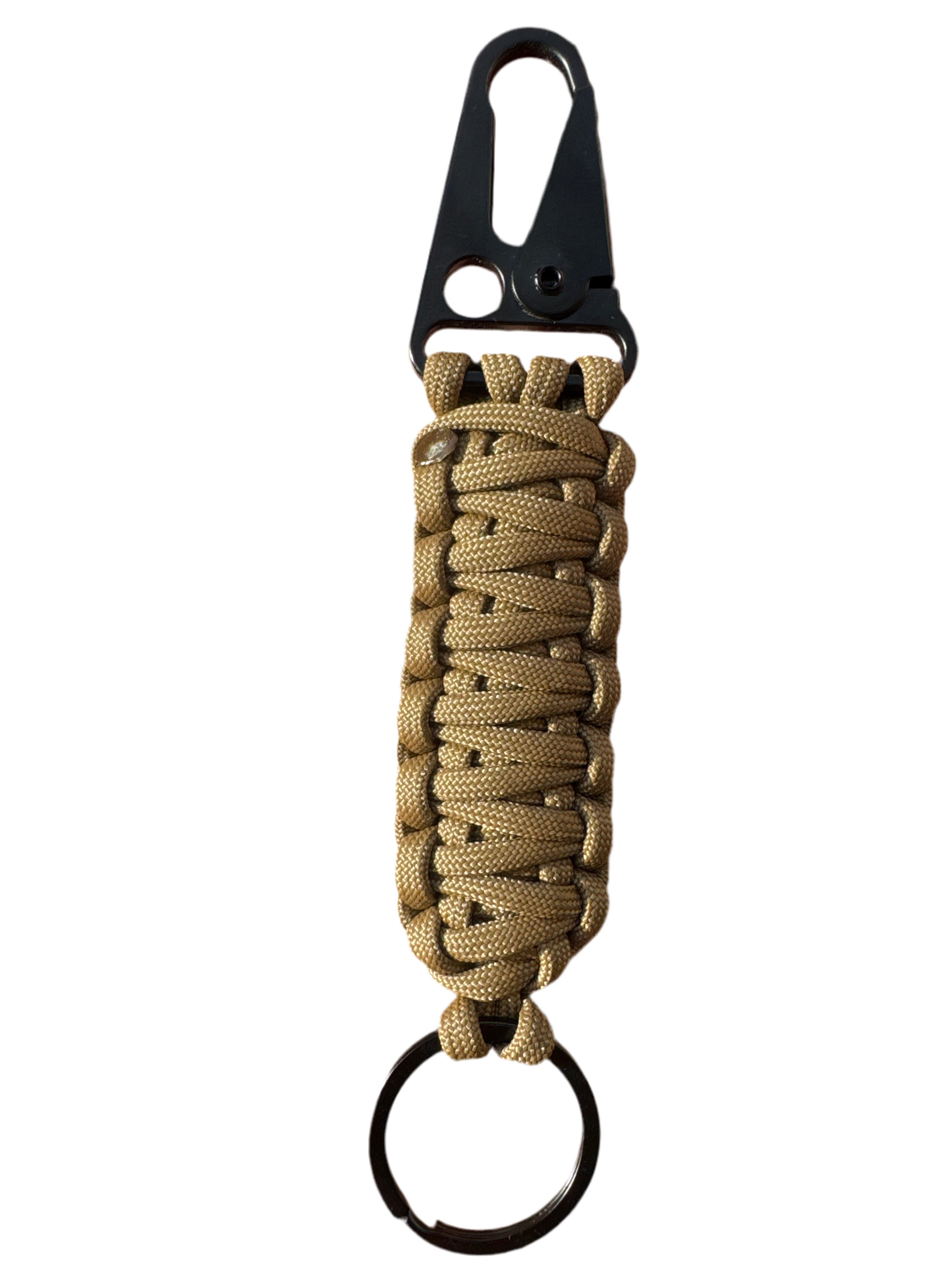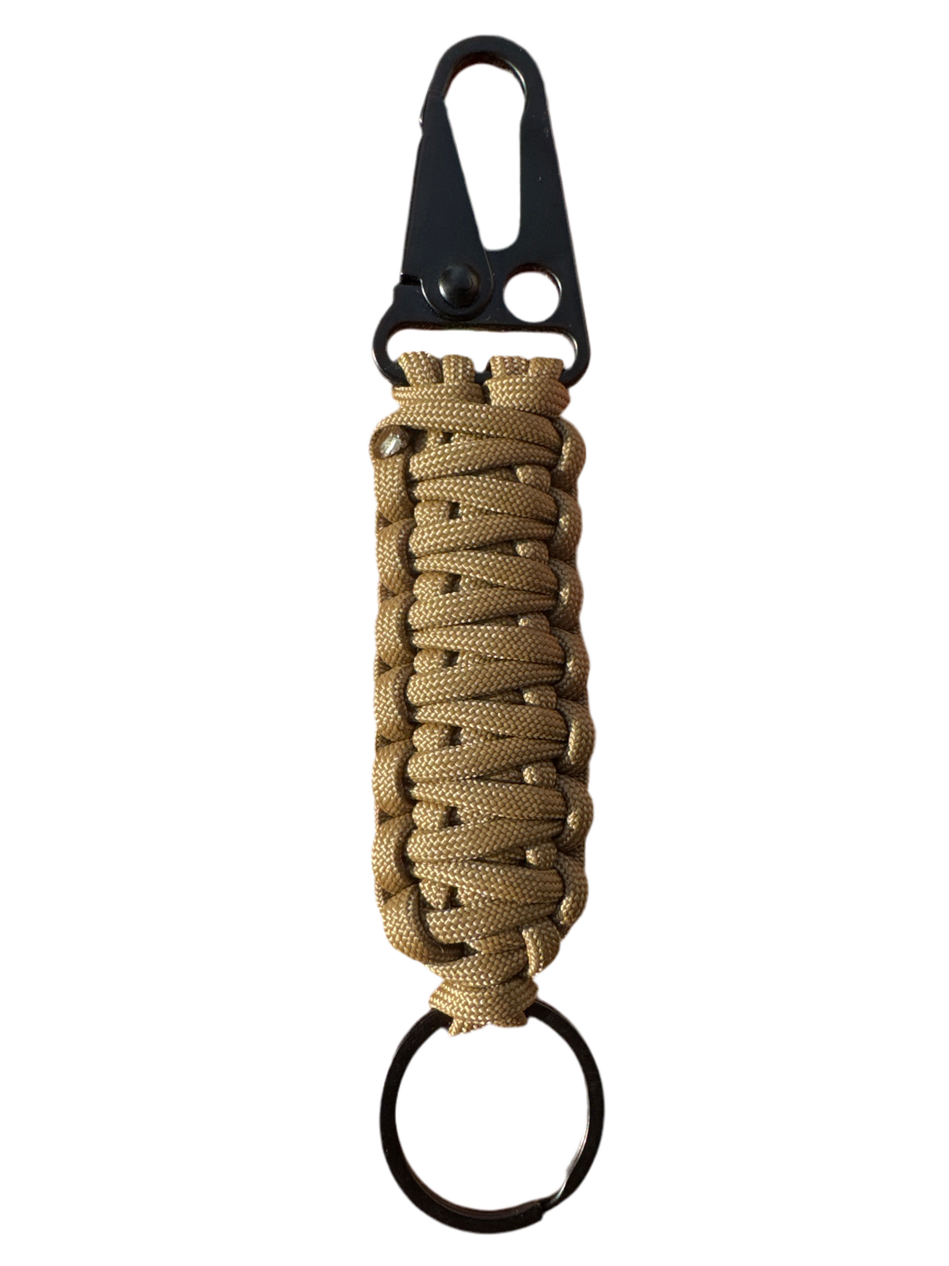 Fabricado en paracord de nylon y acero, este llavero es perfecto para actividades al aire libre, ya que su material es conocido por su alta resistencia y versatilidad. El mosquetón permite una fácil sujeción a cinturones, mochilas o llaves, asegurando que tus pertenencias estén siempre al alcance. Este llavero es una excelente opción para quienes valoran la funcionalidad sin sacrificar el estilo.