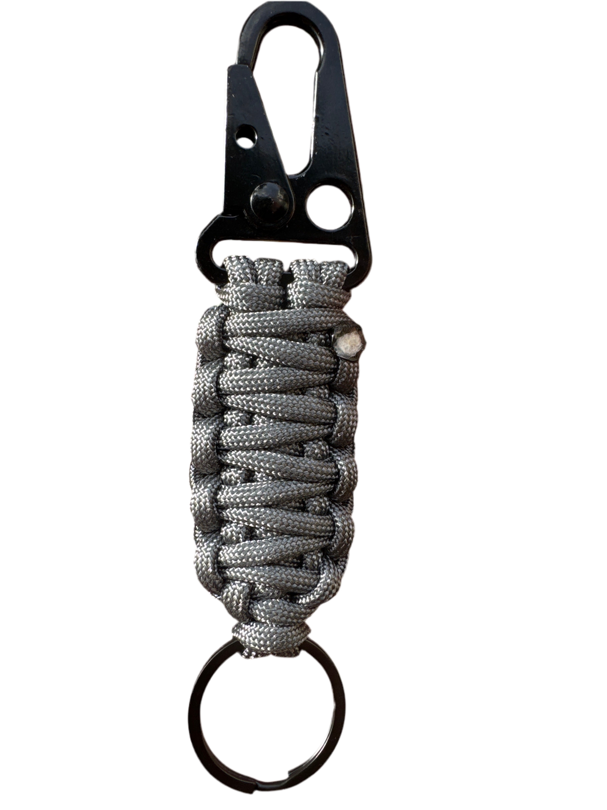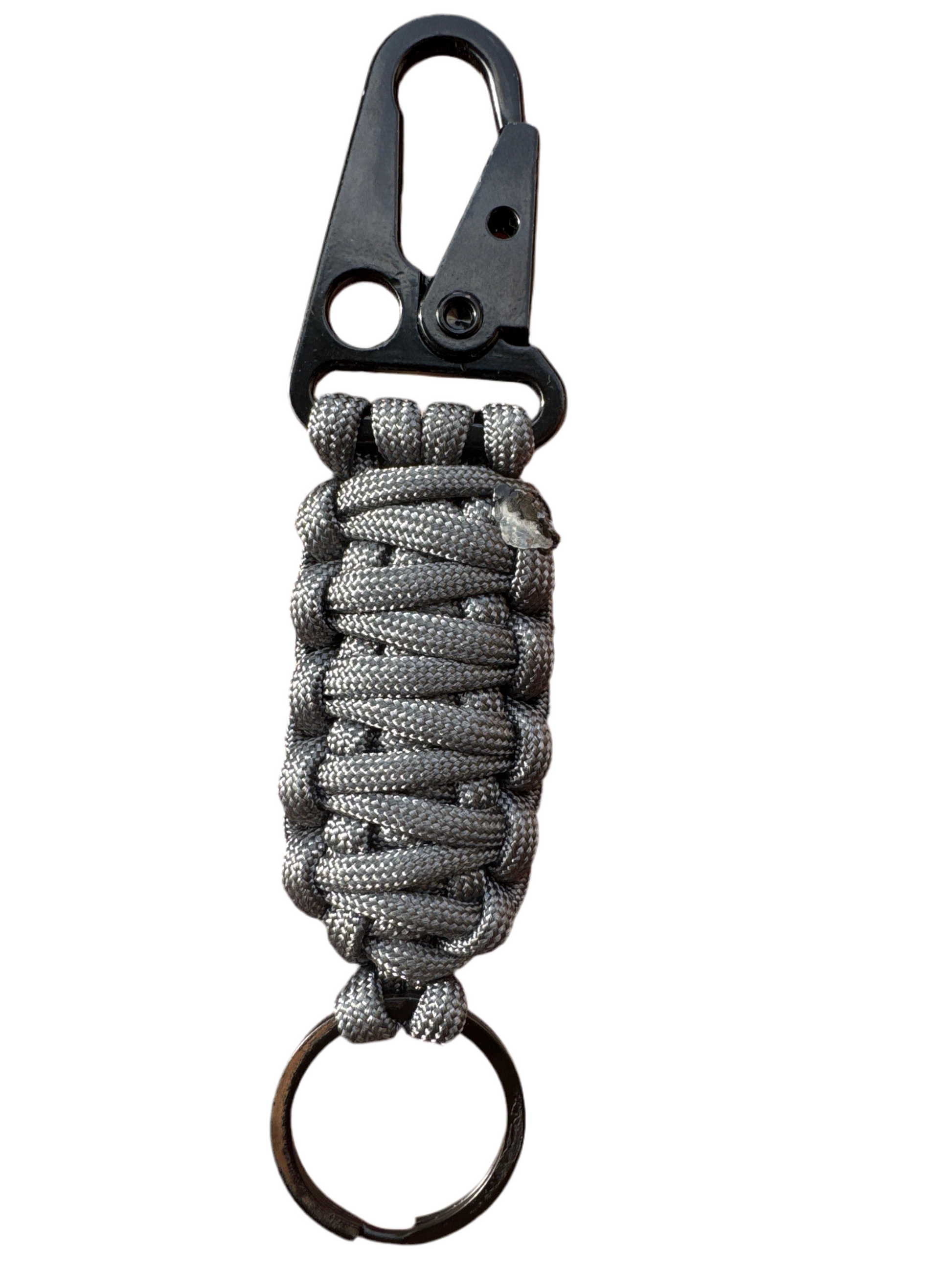 Fabricado en paracord de nylon y acero, este llavero es perfecto para actividades al aire libre, ya que su material es conocido por su alta resistencia y versatilidad. El mosquetón permite una fácil sujeción a cinturones, mochilas o llaves, asegurando que tus pertenencias estén siempre al alcance. Este llavero es una excelente opción para quienes valoran la funcionalidad sin sacrificar el estilo.