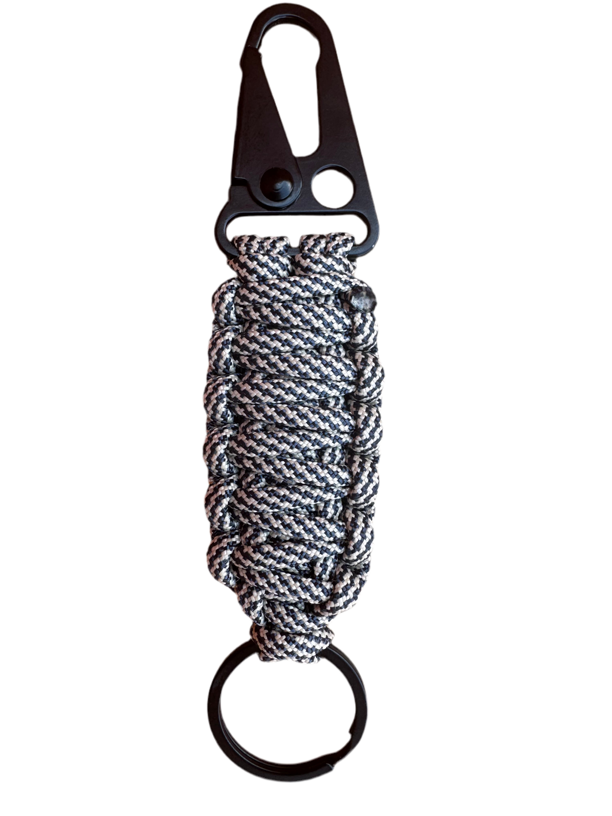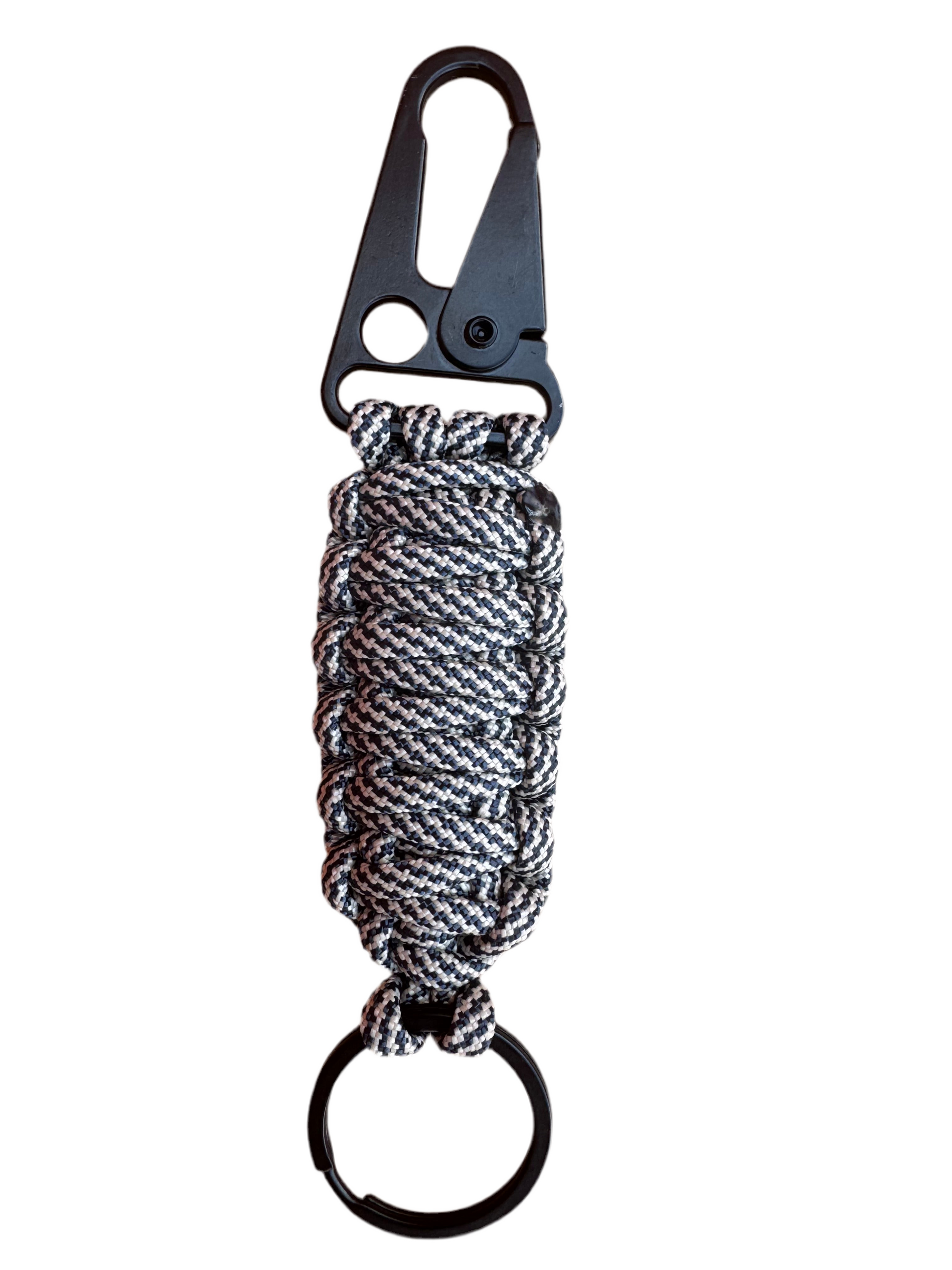 Fabricado en paracord de nylon y acero, este llavero es perfecto para actividades al aire libre, ya que su material es conocido por su alta resistencia y versatilidad. El mosquetón permite una fácil sujeción a cinturones, mochilas o llaves, asegurando que tus pertenencias estén siempre al alcance. Este llavero es una excelente opción para quienes valoran la funcionalidad sin sacrificar el estilo.