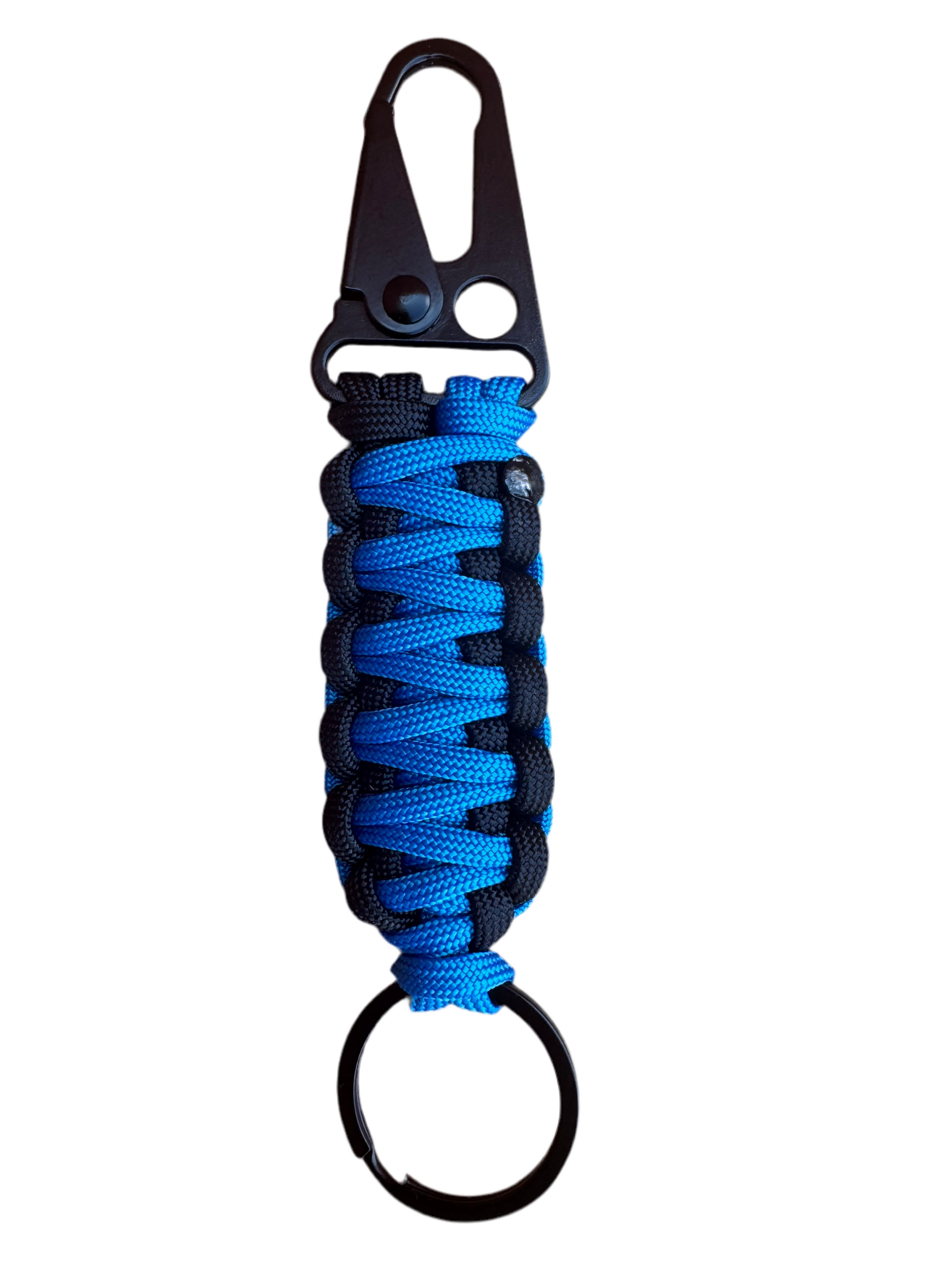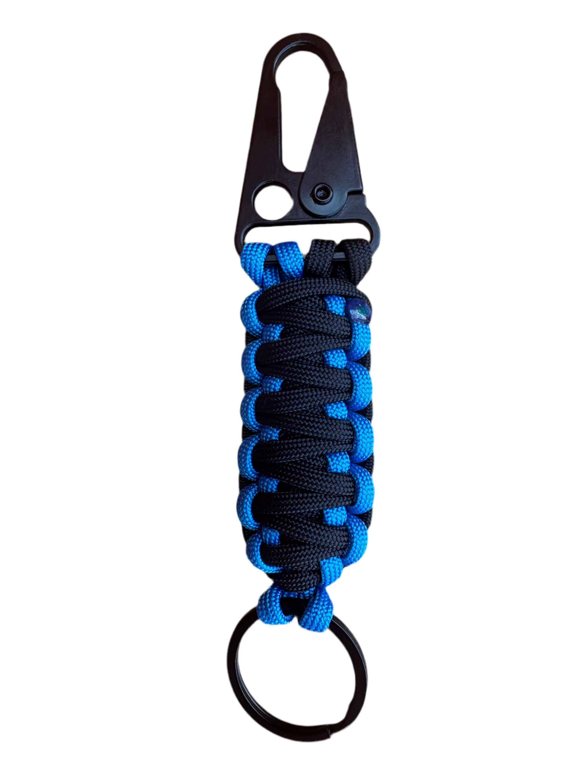 Fabricado en paracord de nylon y acero, este llavero es perfecto para actividades al aire libre, ya que su material es conocido por su alta resistencia y versatilidad. El mosquetón permite una fácil sujeción a cinturones, mochilas o llaves, asegurando que tus pertenencias estén siempre al alcance. Este llavero es una excelente opción para quienes valoran la funcionalidad sin sacrificar el estilo.